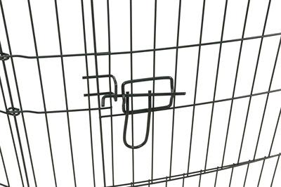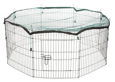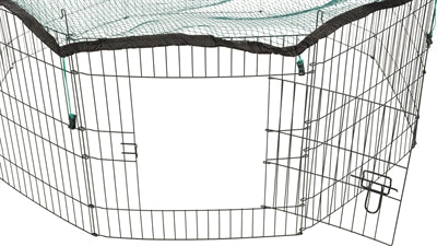 Der Auslauf besteht aus acht Paneelen und verfügt über eine Tür. Die Maschenweite beträgt 1x1 cm.